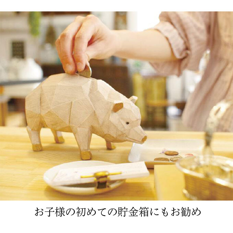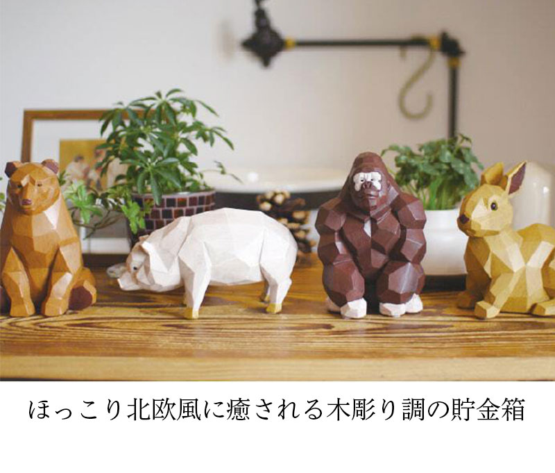 ほっこり北欧風に癒される インテリアとしても優秀な木彫調の貯金箱北欧風インテリアに馴染む、ほっこり木彫調のアニマル まるで木彫りのようなフォルムとリアルな質感が心を癒す、動物たちのマネーバンク。